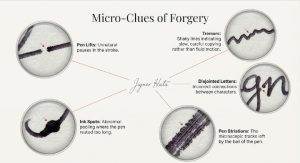 And so, as you learn—you don’t need to learn if you’re a student—you would look for things like pen lifts; you’d look for tremors. You would look for disjointed, incorrect letters. The amateur just looks for size and maybe a wrong letter. That’s really only one piece of the puzzle because a professional will do side-by-side examinations, enlarge it by 500%, look under a microscope, look for the spin pen striations, look for the ink spots, and look for anything that’s similar and different.